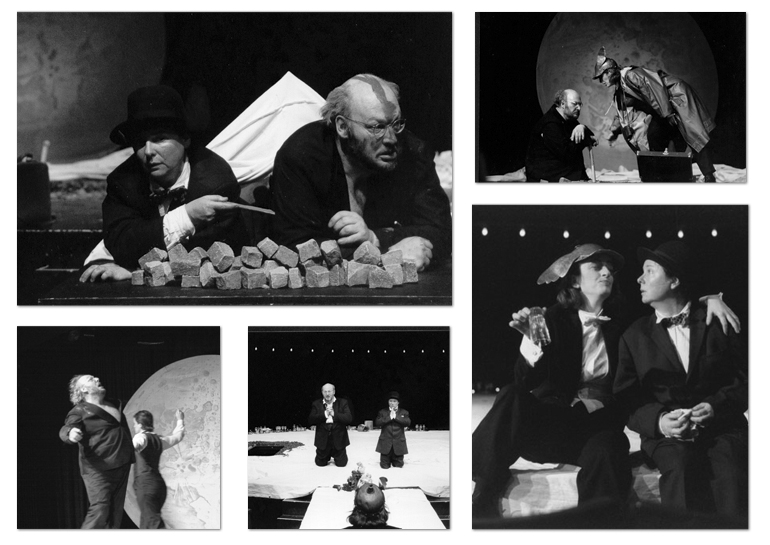 Die Spielfassung hat aus einem Heer von Nebendarstellern in dem Stück die Figur des Dieners Flavius und Apemantus zusammengefügt. Apamantus, der yon der Schauspielerin Dagmar Papula gespielt wird, wird zum Lebensbegleiter von Timon in guten wie in schlechten Zeiten. Servilität und praktischer Verstand gehen darin einher mit einer unerschöpflichen Treue, die hier kein leerer Wahn, sondern ureigene Bestimmung ist. Ein trauriger Clown, der mit seinem Partner Timon an Becketts 'Warten auf Godot' erinnert. Die vielen Nebenfiguren werden durch die Interaktion mit dem Publikum ersetzt und der Götterbote Merkur, mit seinen ironisch, distanzierten Zügen eines spöttischen Beobachters und Kommentators, treibt die Handlung vorwärts. Merkur, gespielt von Barbara Kratz, bekanntlich als Bote auch der Gott der Kaufleute und Diebe, wirft immer wieder die Würfel des Schicksals neu, indem er in opulenter Weise Timon wieder mit dem magischen Treibmittel Geld ausstattet. Aber auch die Begrenztheit göttlicher Möglichkeiten stößt bei Timon an eine Grenze.